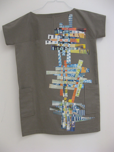 We were asked to make/buy a garment that we would alter as an exploration of our identity. I made the grey tunic as my base. It’s very neutral, simple, clean. Laura called it, “Bauhaus”! I decided to look at the facades of buildings as 2D patterns…thinking of them more as fabric. I decided to further the textile transformation of the facades by weaving the different images together, in a sort of unraveling patchwork. Architecture=facade=pattern=fabric=woven=patchwork