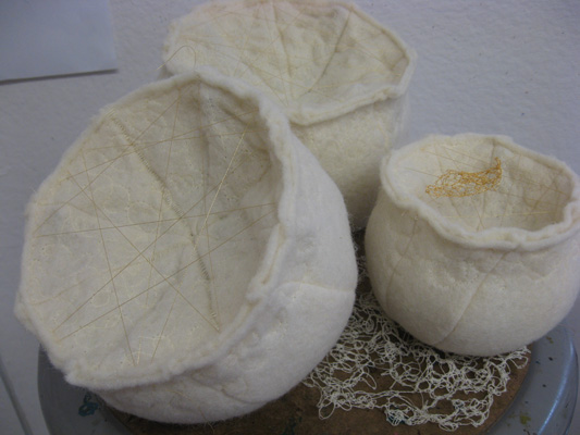 We were asked to create a stuffed textile form. I had ambitions of making a complex 3D form. My seriously limited skills meant that I instead focused on just making a sphere. Then, I wanted the sphere to appear hollowed out…something counterintuitive for a skin that is stuffed…how can it be intented/carved? I added freemotion embroidery at the carved opening. In the process of making these, I thought of one of my favorite poems – “Design” by Robert Frost. This resonated with me, and I thought about ways to take themes from the poem, and translate them into my stuffed form.