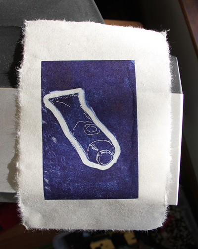Okay, so here is another one in this series. I like this, as I both changed the paper, and I tried to have more ink. These are reductive prints, meaning: I start out with the plate fully covered with ink, and then I wipe away the areas that I don’t want to have color. Messy! So, this last time, I tried to leave more ink on the plate. Better.