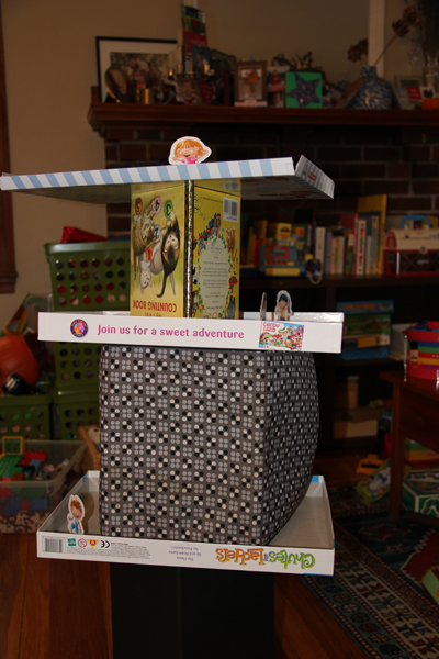 Besides printmaking, my son and I created a contemporary apartment tower for his chutes and ladders people…note the lovely cantilevers and expansive views!  If Fallingwater were tall and made of cardboard…: