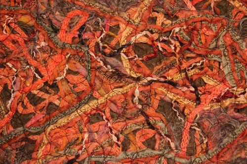 Okay. I had a side project going that has NOTHING to do with printmaking…painting…drawing…etc. I was working on a crazy felted sweater. I JUST FINISHED IT. I was so excited, that I put it on, even though it is still DAMP! I’m so thrilled with it…even though I know that most people will ask me why I am wearing what looks to be just a big pile of yarn. Philistines! It’s wooly poetry… perhaps in an e.e.cummings sort of way. What do you think? Too crazy? Not crazy enough? I have no problem wearing this…I just wonder how many birds will be following me…trying to collect scaps for building their nest. Please excuse that I could not wait to photograph it tomorrow in daylight…so, here I am in the downstairs bathroom…
