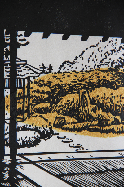 So, I managed to finish that linoleum block that I was working on! I just tried to hunker down and finish it. I like the prints, more or less, so I think that I may do more…in spite of the fact that I’m still not in love with carving linoleum. I also collaged some interesting Japanese papers into some of the pictures. The solid paper was a success…the patterned paper was a total fail.
