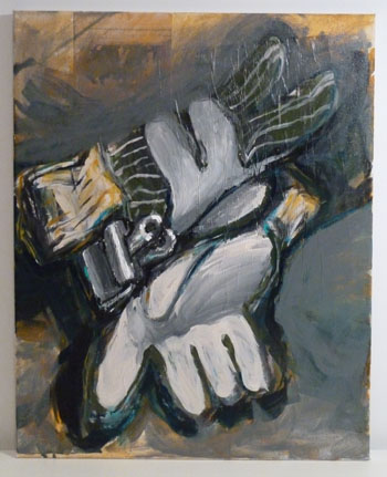 If you can’t discern…it’s a still life of gardening gloves and a binder clip. Don’t ask me what that melange means. Anyway, I was trying to keep it fairly abstract, but my teacher kept prompting me to “fix” it so that it looked more “correct”. I guess my abstraction wasn’t capturing the essence of the forms as much as when I just caved in and tried to paint the objects, albeit in a messy way. The majority of this painting was done with a small paintbrush, like the flat kind that you get in a hardware store to paint the trim on your door or something. I like the marks that this kind of brush gives. I’m generally happy with it, although I’m still scratching my head how as to be more “abstract”. Why, you ask, am I trying that? I just like abstract art over realistic art. I’m naturally wow-ed by anyone who can paint in a photographic manner. But, I don’t like that kind of art, really. I like abstraction. Thus, I am continuously attempting to move in that direction.