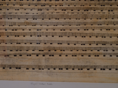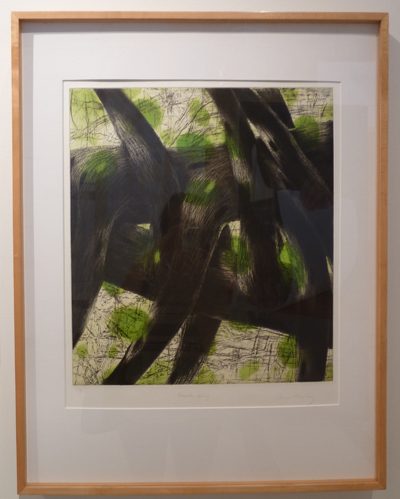 This work by Nona Hershey is titled, “Branches, Spring.” I love the soft green areas behind the strong tree boughs. My photo does this print no justice, but I loved the texture of the bark, and the three-dimensional quality of the interlaced branches. I also love all of the scratchy black lines in the background. It is soft, yet hard. Here is her website. (please look) Next: