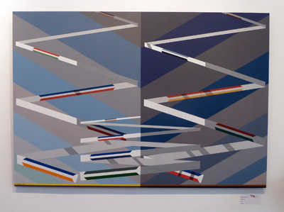 I think that this is speaking to my inner architect again. I like it. I don’t know why. Something about it feels kind of dated, but I like the space that’s created…especially in the right hand side. I keep wanting to crop it into a square…with the lighter side becoming just a slim rectangle next to the darker side. Maybe that’s just me. If we were in architecture school, and a critic felt the same way…(s)he would likely get a hacksaw and start cutting the canvas to show you how much better it would look. Actually, because this series of paintings is based upon airports, this symmetry and landscape orientation makes more sense to me conceptually. (not that it didn’t make sense before…)