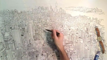 Please watch this video HERE of him completing this drawing. Pretty amazing, right??? I notice that a little hand didn’t come over and put down some little conglomeration of Lego. Hmm. He must have different working conditions from me. I assume that he’s drawing from a computer image, but if that’s the view out his window…then his working conditions are RADICALLY different than mine. (I’m not complaining…just an observation, mind you…obviously, his studio must “want” to be that way…)