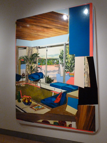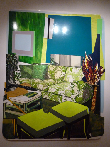 LOVE IT!!!!! She has done a huge series of collages of what looks like trendy, 60s interiors. Then, she translates these collages into ENORMOUS paintings on panels with…(wait for it)…RHINESTONES. They are BEDAZZLED, and they are awesome.