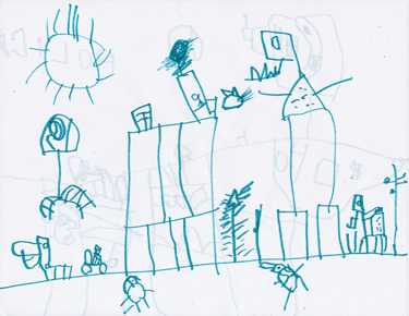 Sigh. I have such love for this. In the upper right…we have a woolly mammoth. Standing on the right side of the excavation is a saber toothed tiger (note the sizable, saber-shaped teeth…nice!). The form on the left of the excavation is a huge digger/excavator working on the hole. Then, in the upper left, is another saber toothed tiger which is pouncing on said digger. BRILLIANT! I hope that he draws forever.