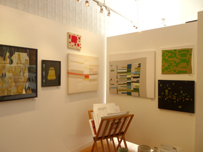 Roberts creates gorgeous abstract fabric paintings in a mix of both bold and subtle hues. She not only plays with beautiful color palettes, but the texture of the fabric also varies. My favorite pieces were those with a color field surrounded by an unsymmetrical white background. Two of those pieces are in the photo above on the right side.