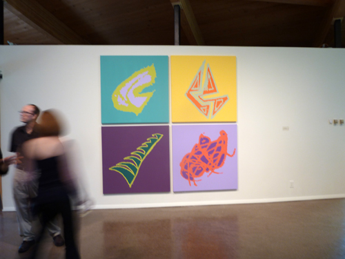 The show is titled, “Iconic.” She plays with the subconscious markings of other people and magnifies and intensifies them into monumental glyphs. The forms, compositions and colors are very compelling. I can’t help but wonder who made each of these marks? I love the mysterious quality of them.