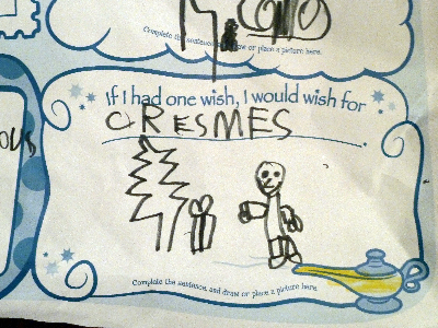 Okay, how friggin’ cute is that???? He’s wishing for Christmas. Notice that all that’s needed is himself, a present, and a tree. Notice also the enormous grin on his face. Mommy is probably still asleep upstairs in this image. I know…I know…he didn’t wish for “peace on earth” or anything thoughtful like that. We’re working on peaceful at home before we move onto the whole dang planet.