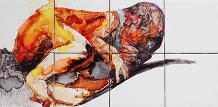 An installation on bathroom tiles where drawings make visceral vignettes, showing moments ranging from giving birth to getting booked. A shape-shifting protagonist emerges from the tiles. She morphs in time and race and limps along at odds with expectations but at one with viscera.