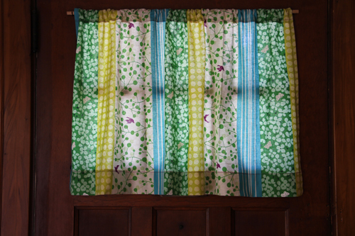 I also FINALLY finished a house project that I have been planning on doing for practically a year as well. I finally made a little curtain for our front door. Yes, I know…not a big deal. What is a curtain, anyway? Just a rectangle of fabric, right? Well, yes it is…and I finally did it. Here it is: