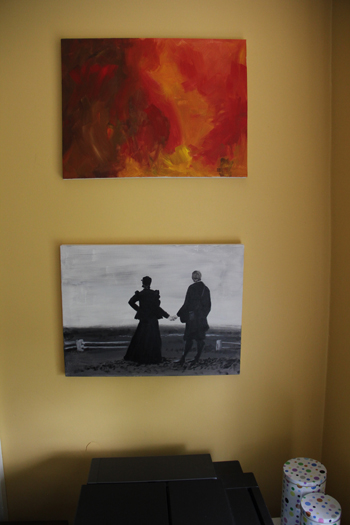 Not much going on art-wise. I took a stab at acrylic painting. Not so good. Luckily, I am taking a painting class this fall…so I should get some pointers! I know. Why have I spent the past year developing my printmaking knowledge, only to switch gears and start painting? Because it’s ALL so fun! So, I’m back to square one…learning how to paint. I did take painting in high school…and I have had a watercolor class and an oil painting class since then. Needless to say, I am at the bottom of the learning curve. I hope that there is no where to go other than up. Here they are on the wall: