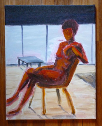 Strangely enough, that one looks a little like me. Not on a good day, of course. I showed these to my painting teacher. He said that they were “postmodern”. Hmm. I guess that means anything that isn’t “modern” pretty much. He likes modern painters, like Pollock and De Kooning. So…I think that he prefers much more loose and “painterly” paintings. That means more apparent brushstrokes, etc. As a result, I tried in his class to invent a figure painting that was more painterly: