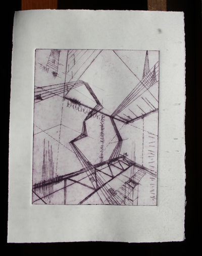 These are the drypoint prints that I made. I incorporated a little of that carborundum technique. This is where there are areas of dense color. I’m not sure that it was so successful, so I’ll have to try again.