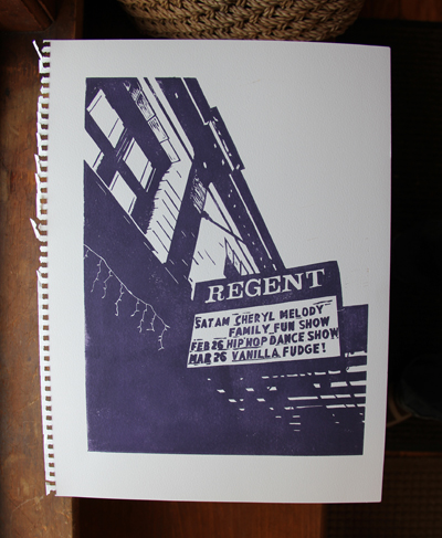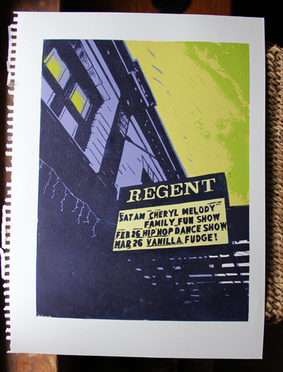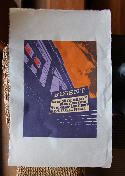 And…last but not least…I did another color scheme of the Regent theater print. I am going to submit this print with the other one to the local show. Yes, I’m not sure if the ink will totally be dry by tomorrow am! I wonder if I could speed up the drying with…a hairdryer? A tanning bed? Probably not.