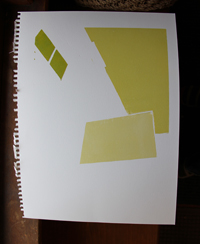 Ech. Needs work. In mulling over ideas with my super helpful teacher, I felt that adding some “chine colle” or collage would help. So, I took another piece of paper, and just started randomly printing on it. I plan to rip up this paper and layer it onto the print above, in an attempt to help it along. Here is the sacrificial page:
