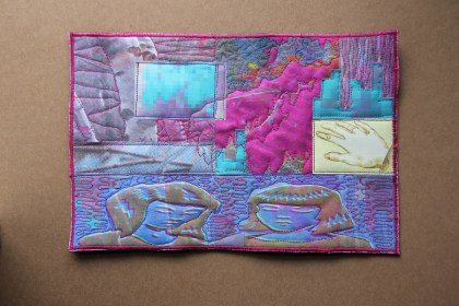So, I have MOSTLY finished the mini-quilt. What do you think? I think that it needs something…messy, added to it. I haven’t decided what, though. So, in the meantime, I’m just going to leave it. Let me just say that finishing this little thing was a serious effort, as my sewing machine was NOT cooperating. Luckily, when I took it to Marie’s Sewing in Woburn, they were so helpful and got me back on track. That machine is VERY temperamental/fussy/prone to pouting and refusing to work. Much like me! We’re a perfect fit! Anyway, I’d like to keep going with the quilting. Maybe if I make enough of these, I can join them into one big quilt. Notice that I do not yet have the energy/gumption to make a big quilt in and of itself. Someday…