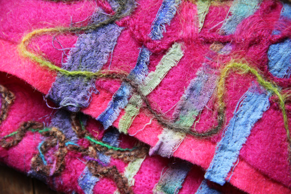 This is a bunch of different fabrics/yarns, etc merged into one fabric through needle felting. You basically use a barbed needle to poke through the layers, and fuse them together. It’s pretty interesting how different fabrics behave when felted like this. I have no idea what I’m doing with this thing, but I’m just going to keep adding to it.