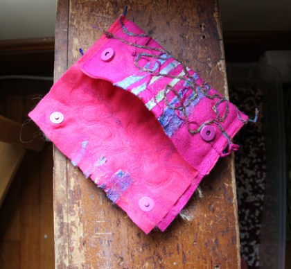 My first felting experiment…hmmm…needs work. I can see how this might become addictive, though. You can just keep throwing stuff on it and see what happens. I don’t think that you can take something off if you change your mind, though. Not a big deal, as I don’t expect this to be on the cover of any magazine…ever.