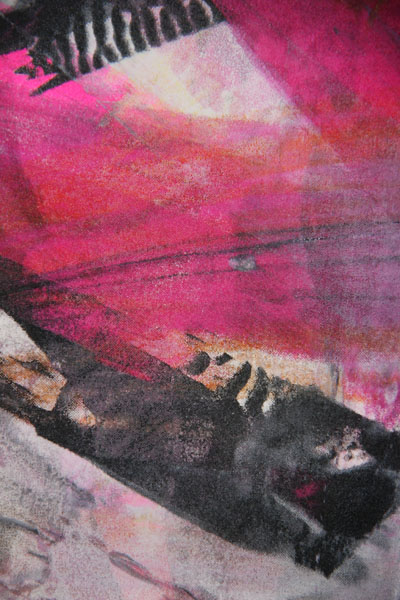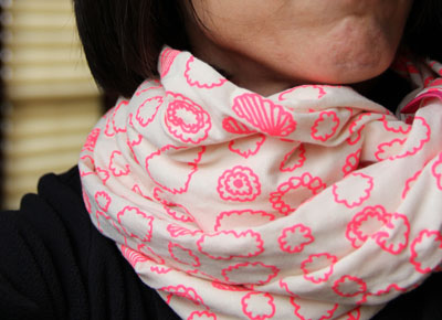 Isn’t it so neat? I love hot pink, and this squishy scarf had hot pink puffy clouds silkscreened onto it. MINE! (hmm…should have used the fuzzy filter in photoshop elements…need to hide the scar on my chin…)