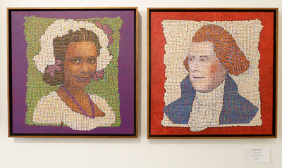 No, these aren’t fabric, they’re paintings! This artist’s technique is inspired by textiles, as I learned from his website. The images are comprised of tiny blobs of multicolored paint, gridded much like needlepoint. No joke. Isn’t that amazing?