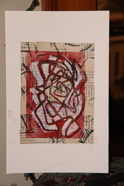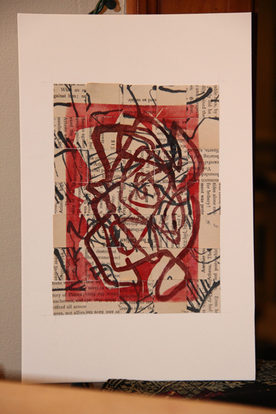 Okay, here is my print for the day. Again…not so good. (try to be surprised) It took me a couple of hours. I know. Doesn’t look like it. The collage part took a while. I’ve been pretty hesitant to do any type of collage work. I took a collage course in grad school with this pretty well respected painter teaching it. Anyway, he didn’t think much of what I did. Neither did I. As a result, I’ve kept my distance from collage, as I have decided that I’m bad at it. Now, as I’m trying to throw caution to the wind…I’m trying it again. We’ll see how it goes. I’m liking the whole glue stick thingy. It feels so “elementary school” and fun.