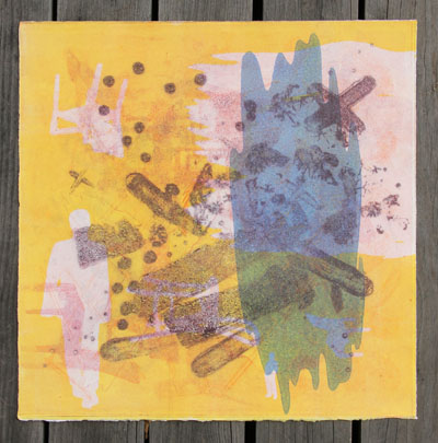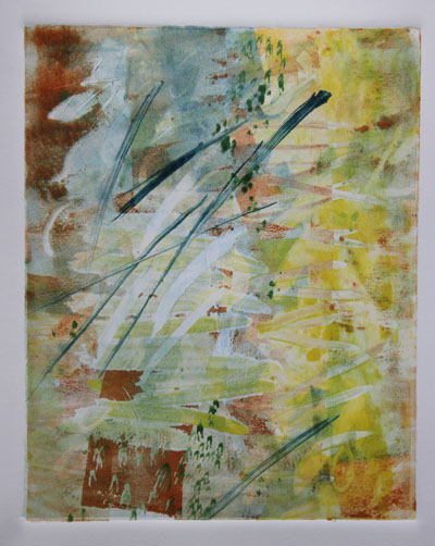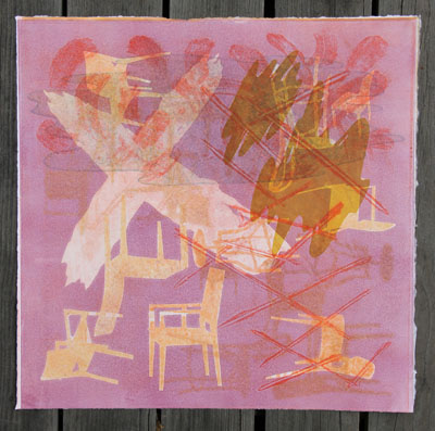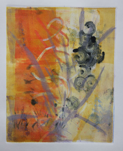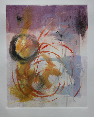 The carborundum element in this next print are the lavender brushmarks. So, I printed that lavender carborundum plate on top of a monotype (thus creating a monoprint):