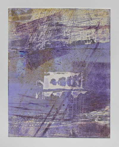 The carborundum element in this next print are the lavender brushmarks. So, I printed that lavender carborundum plate on top of a monotype (thus creating a monoprint):