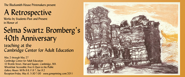 There is a print show featuring Selma Bromberg at the Cambridge Center for Adult Ed, where she teaches. This is my printmaking teacher. In addition to showcasing her lovely work, there is also a part of the show that is student work. Please come see it!