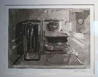 This is so amazing. I think it’s an aquatint. Doesn’t she capture the light and feel of the ubiquitous mini fridge? Look at the Pur water pitcher! Look at the Glad storage containers! Brilliant.