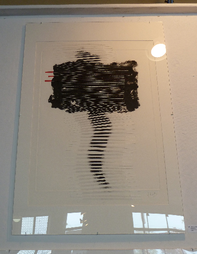 I’m sorry that this photo isn’t great. Both the glare and the height which it was hung make it a challenge to see this well. This is the work of a printmaking teacher that I had for several months. She’s super talented, and works a lot with carborundum collagraphs. I believe that there are actually strips of paper collaged on, which you can sort of see here. I like the contrast between the delicate paper strips and the heavy inked area near the top. Lovely!