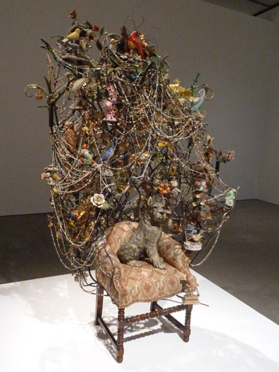 You’ll notice that there isn’t any plastic “junk.” It’s mostly beads, metal ornaments, ceramic figurines of birds/fruit, and brightly colored afghans. I think because of this palette, and because the items don’t appear broken or damaged, there is a certain refinement and respect for the materials. While it does look haphazard, the figurines do have an orientation and are placed upright…the beads are draped and not wadded up/thrown on, so there is some order to the chaos. HOW he managed to fix all of these things together with no apparent fasteners is VERY interesting. They aren’t bound together as much as suspended somehow…
